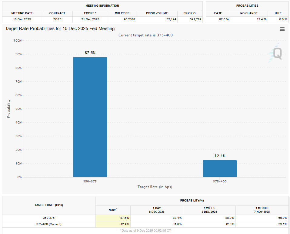 Three weeks ago, sentiment was in the dumps. The S&P violated its 50-day moving average, and we saw classic capitulation behavior. The markets shifted from pricing in +85% of a December rate cut to a sub-50% chance, while the underlying economic picture did not change at all. The job market is weak, and that’s what the Fed cares about. Fast forward to today? Implied volatility has collapsed, positioning has been reloaded, and we’re going into the FOMC with the market pricing an 88% cut.